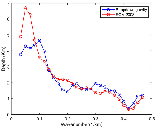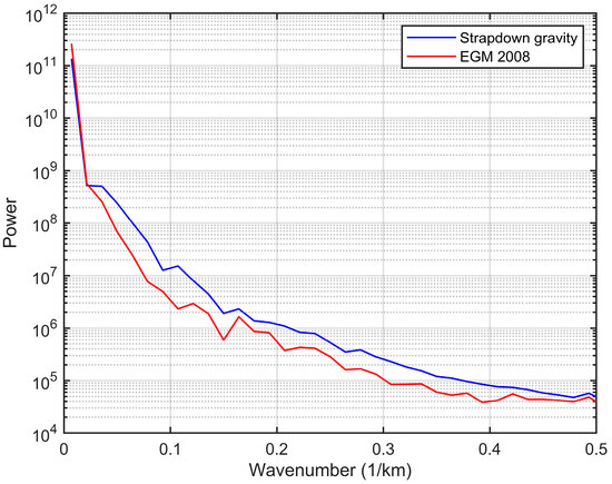 Semi-log plot of radial average power spectrum of strapdown gravity dataset compared to the EGM2008 model. The two power spectral densities are averaged on the same area using the same spatial resolution.