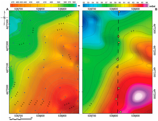 A total of 49 terrestrial gravity measurements were conducted in the area surrounding the Sos Enattos site. The survey was carried out using the CG6 gravity meter (Scintrex Co., Ltd., Vaughan, ON, Canada), a fully portable system with a reading resolution of 0.1 µGal and a standard deviation of <5 µGal. Additionally, this instrument benefits from very low intrinsic drift (<10 µGal per day) and a tare of 5 µGal, enabling simple and fast data correction during post-processing.