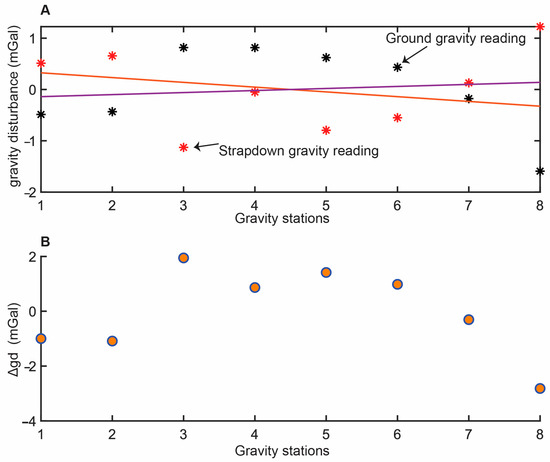 During the Sos Enattos campaign, the lever arm offset gravity sensor with respect to the GNSS antenna was fixed at Parma airport before the beginning of the flight procedures and remained unchanged throughout the survey. The applied offset values were −0.393 m, −0.578 m, and −1.148 m along the X, Y, and Z directions, respectively. Additionally, a figure-eight flight maneuver (see inset in Figure 1C) was performed to capture maximum variations in pitch, roll, and heading. These data are crucial for the lever arm calibration performed by the iPosCAL-GRAV software.