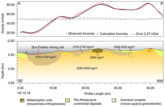 A qualitative interpretative model of the gravity signature in the Sos Enattos area was performed using a 2.5D forward modeling approach (GmSYS by Oasis Montaj software, version 2022.1). This technique enables a detailed reconstruction of the subsurface structure by iteratively adjusting the geometry and density of the causative bodies to achieve the best fit between observed and computed gravity profiles. The model accounts for variations in the size and shape of geological units both along the profile and in a direction perpendicular to it (2.5D dimensions; additional details in [60,61]). The forward model was constructed along a 44 km-long NNW–SSE oriented profile, which crosses the Sos Enattos mining site and intersects the major local lithological boundaries. The location of the profile is shown in Figure 1B and Figure 4A. The modeling was initially set up based on the spatial distribution of local geology, specifically considering the lithological contacts intersected along the profile. Minor discrepancies from the geological map were observed, which are attributed to adjustments made during the gravity data best-fitting procedure. The densities assigned to the rock units were based on values reported in the literature [51,52,53]. In addition, rather than assigning a single fixed value, a range of densities was used (e.g., 2700–2750 kg/m3 for metamorphic units) to account for the extended length of the profile, the scale of geological bodies, and the natural variability in rock density.