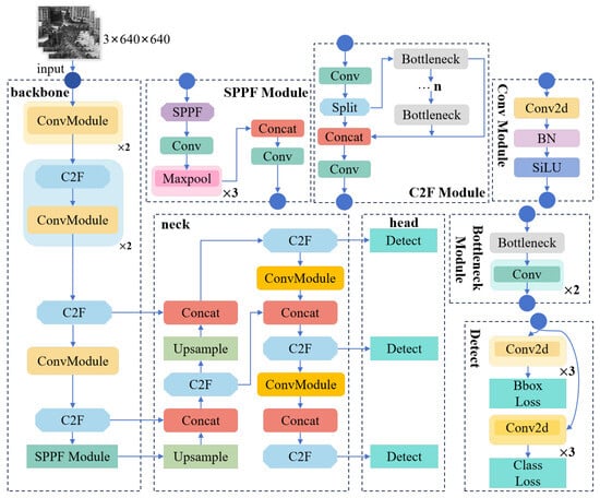 YOLOv8 is a family of YOLO models released by Ultralytics in 2023. It can be applied to multiple computer vision tasks, including image classification, object detection, instance segmentation, and keypoint detection. The model is available in five different sizes, ranging from the compact YOLOv8n to the large YOLOv8x, with detection accuracy increasing alongside model size. The YOLOv8 architecture consists of four primary components: Input, Backbone, Neck, and Head. The Input module preprocesses images for efficient network processing, employing adaptive scaling to improve both image quality and inference speed [23]. The Backbone consists of Conv, C2f, and SPPF modules that collaboratively extract features from the input. Notably, the C2f module integrates two convolutional layers and multiple Bottleneck blocks to capture richer gradient information [24], while the SPPF module applies three successive max-pooling operations to harvest multi-scale object features, thereby enhancing detection accuracy across various object sizes [25]. The overall YOLOv8 architecture is illustrated in Figure 2.