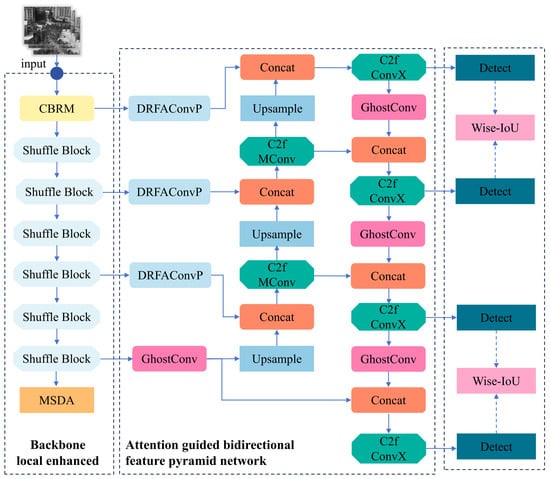 - In the Backbone network, an efficient ShuffleNetV2 architecture is employed and integrated with the MSDA mechanism. This design significantly reduces computational overhead while leveraging MSDA’s dynamic focusing and contextual awareness capabilities to strengthen the extraction efficacy of critical features.