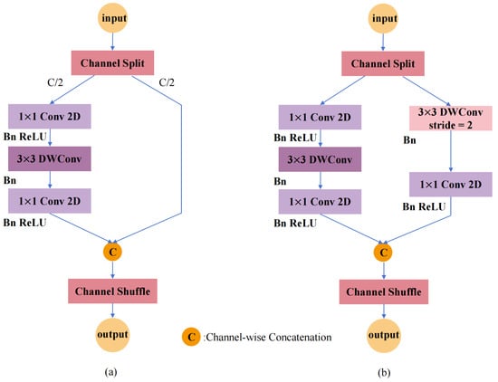 For the basic unit, as shown in Figure 4a, input channels C are separated into dual pathways (typically and ). One path serves as an identity mapping, which is directly passed through, effectively achieving feature reuse. The other path processes features using a combination of a standard convolution (kernel size 1 × 1), a depthwise separable convolution (kernel size 3 × 3), and activation layers. This design enables efficient cross-channel feature fusion while minimizing computational overhead. To prevent network fragmentation and improve operational efficiency, feature channels are not evenly divided. Furthermore, a serial structure is used to ensure consistent channel widths across all convolutional layers, thereby minimizing memory access costs. Channel shuffle is also employed to facilitate effective communication between different channel groups.