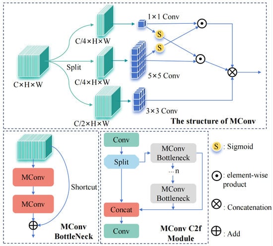 MConv (Figure 7): The input (C channels) is split into three branches of C/4, C/4, and C/2 channels. These are processed by 1 × 1, 5 × 5, and 3 × 3 convolutions, respectively. The output of the 1 × 1 branch, after a Sigmoid activation, is element-wise multiplied with the output of the 5 × 5 branch. Finally, the attention-enhanced features, the 3 × 3 branch’s output, and the original output of the 1 × 1 branch undergo concatenation to restore C channels.