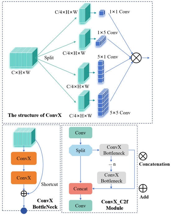 ConvX (Figure 8): The input (C channels) is uniformly split into four branches (each C/4). These are processed by 1 × 1 Conv, 5 × 1 Conv, 1 × 5 Conv, and 5 × 5 Conv, respectively. Finally, the four branch outputs undergo concatenation to restore C channels.