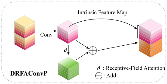 While GhostConv provides an effective theoretical framework for model lightweighting, its reliance on static and homogeneous linear transformations to generate “ghost” features inevitably sacrifices feature richness—a critical drawback for detail-sensitive UAV remote sensing tasks. To break this “efficiency–performance” trade-off, we propose DRFAConvP, a novel method that transforms GhostConv’s simple linear operations for feature generation into an intelligent feature enhancement process. This innovation integrates two advanced concepts: (1) the multi-branch heterogeneous processing from our composite convolutions, and (2) a dynamic input-dependent spatial attention mechanism inspired by RFAConv [35]. As illustrated in Figure 9, DRFAConvP’s core advancement lies in its dynamic attention mechanism and sophisticated heterogeneous transformations, enabling stronger feature representation at low computational cost; the structure of the receptive-field attention mechanism is detailed in Figure 10.