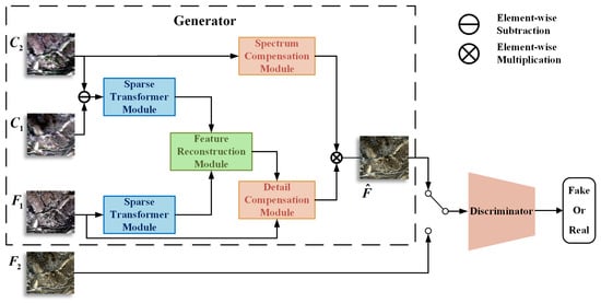 To overcome the limitations of existing deep learning-based multi-source remote sensing spatiotemporal fusion methods, this article proposes a novel approach based on GAN and sparse transformer. The generator consists of three main stages: feature extraction, feature fusion, and information compensation. In the feature extraction stage, a Sparse Transformer Module is applied to reduce computational complexity while preserving the model’s feature extraction capability. During feature fusion, the Feature Reconstruction Module leverages a channel attention mechanism to flexibly integrate spatial detail and temporal variation features. In the information compensation stage, the Detail Compensation Module applies frequency-domain decomposition to recover high-frequency details, thereby enhancing spatial fidelity. Meanwhile, the Spectrum Compensation Module improves spectral fidelity by incorporating band correlation constraints.