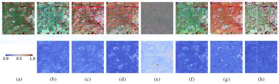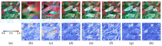 56]. RMSE quantifies fusion error, with lower values indicating better performance. PSNR focuses on pixel-level differences and is widely used for image quality assessment: higher values correspond to better image quality. ERGAS is a relative, dimensionless global error metric for assessing the quality of synthesized remote sensing images: lower values indicate better quality. SAM measures spectral distortion between generated and real images: lower values suggest greater spectral similarity. SSIM assesses perceptual quality, with higher values indicating better structural and visual consistency. UIQI evaluates the overall similarity between the generated and real images: higher values denote better agreement. In addition to quantitative metrics, visual inspection is conducted using standard false-color composites (NIR-Red-Green) to synthesize color images. Furthermore, absolute average residual maps are used to visualize pixel-wise differences between the generated and real images, enabling direct comparison across methods.
