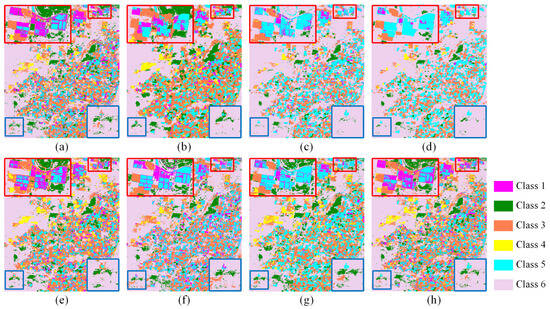 To further validate the practicality of the proposed method, a classification experiment was conducted to assess the quality and usability of the fused images. Specifically, a Support Vector Machine (SVM)-based classifier was used to classify fused images generated from the CIA dataset. As the CIA dataset lacks predefined land cover categories, the images were manually categorized into six land cover types. Classification results from the fused images generated by SFT-GAN and other competing methods were compared with those from true high-resolution images. The results are shown in