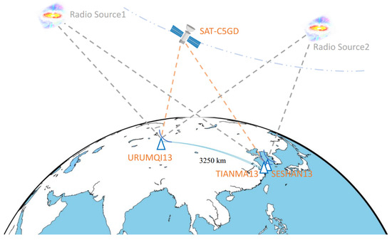 The experiment described herein was conducted using the Chinese VGOS stations SESHAN13, TIANMA13, and URUMQI13, as listed in Table 1. The longest baseline of approximately 3250 km is between the SESHAN13 and URUMQI stations, and the shortest baseline of approximately 6 km is between the SESHAN13 and TIANMA13 stations. Both stations are equipped with broadband receivers to receive dual linear polarized signals, Chinese VLBI Data Acquisition System (CDAS-2) backends, MARK6 recorder systems, and hydrogen atomic clocks for time synchronization. The VGOS Delta-Differential One-way Ranging (Delta-DOR) experiment was performed on 28 April 2023, from 05:10 to 06:40 UT. The experiment code was t3428m, and the observation geometry is shown in Figure 1. The Chang’e 5 lunar orbiter (SAT-C5GD) and the nearby radio sources (0552+398 (Radio Source1) and 0738+313 (Radio Source2)) as calibrators were observed alternately.