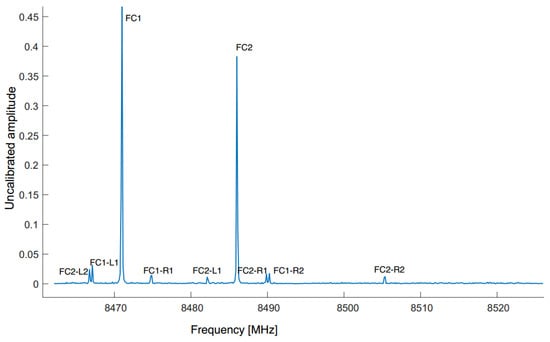 The Chang’e 5 lunar orbiter is equipped with several VLBI beacons. Two DOR beacon carriers centered on FC1 = 8471 MHz and FC2 = 8486 MHz. Only one carrier was used during data processing, with the other as a backup. As shown in Figure 2, the distribution of the DOR signals was derived from SAT-C5GD observation data. Each DOR has one carrier and four DOR tones designed in accordance with the recommendations of the Consultative Committee for Space Data Systems [22]. The DOR tones R1 (the right tone, e.g., FC1-R1, FC2-R1) and L1 (the left tone, e.g., FC1-L1, FC2-L1) are the first DOR tones, and R2 and L2 are the second DOR tones. The frequencies of the first and second DOR tones are calculated as DOR1 = FC ± FC/2200 and DOR2 = FC ± FC/440.