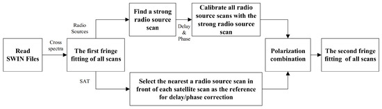 The cross-spectra of each scan comprise four polarization products: XX, YY, XY, and YX. Calibrating the delay and phase of each polarization product was necessary before combining the polarization products of each scan. Figure 5 shows the post-correlation processing for the cross-spectra. The details are as follows: