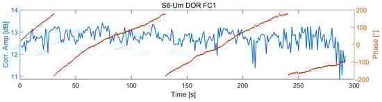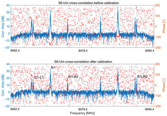 Figure 8 shows the SAT-C5GD fringes of the S6-Um baseline in the frequency domain. The upper panel shows the magnitude and phase plot before correlation processing, which reveals the disorder phases (red) of the DOR signals. The delay and phase calibration used for target signals effectively improved the baseline SNR, as evident from the phase in the lower panel of Figure 8. The phases within a narrow band of FC1, FC1-L1, FC1-R1, and FC1-R2 were aligned.