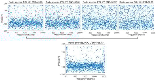 - Delay and phase calibration of the polarization products of scans: Following the first fringe fitting, the scan with a high SNR (≥30) on all polarization products was selected as the reference for the radio source signals. Calibrations were performed for all radio source scans using the delay and phase values from the reference scan. In the case of satellite scans, a radio source scan before the SAT-C5GD scan was used as the reference for delay and phase correction. In this experiment, no radio source was observed before the first SAT-C5GD scan. Therefore, the calibration for the first SAT-C5GD scan was performed with the radio source scan obtained subsequently.The experiment yielded three baselines: S6-Um, T1-Um, and S6-T1. A specialized calibration method was implemented to ensure the three-baseline residual time-delay closures. The symbols c, u, and t represent the S6, Um, and T1 stations, respectively. Using a radio source scan of the S6-Um baseline as an example, four polarization products (XcXu, YcYu, XcYu, and YcXu) were obtained after correlation. The X polarization of u was taken as the reference, i.e., the delay of () was set to zero (delay and phase were the same way; here, the delay calculation was used as an example). The X polarization delay of c () was obtained with the following:The Y polarization delay of c () was obtained with the following:Then, the Y polarization delay of u () was obtained withThese delay values were then used to correct the four polarization products of the S6-Um baseline, and the same strategy was used for phase calibration. The and (delay and phase) values of T1 were obtained from the T1-Um baseline using the same method, utilizing the X polarization of u as a reference, and the (delay/phase) values of u were not recalculated. The S6-T1 calibration values were calculated from the X and Y polarization delay/phase corresponding to c and t, which were obtained previously. is given as follows:Table 2 lists the delay/phase values used for calibration, corresponding to Channel 1 of each baseline for radio source No0009. The processing of XY/XX was unnecessary, given that the differential parallactic angle between stations S6 and T1 was essentially zero and the fringe of XY/YX was approximately non-existent.