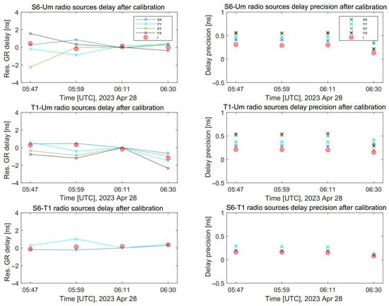 where is the delay precision, B is the bandwidth. The second fringe fitting of the radio source scans was performed on the XX/YY/XY/YX and I (see Figure 5). The integration times were the scan durations, as listed in Table 3. The residual delays and delay precision of the radio source scans for XX/YY/XY/YX and I are shown in Figure 9. The figure shows the residual delays for the three baselines (S6-Um, T1-Um, S6-T1) in the left column and the delay precision in the right column. The residual delays of XX/YY/XY/YX show variations of -4.50 to 3.00 ns over the scan duration. In contrast, the residual delays in the I are smaller, with variability near 0 ns. The delay precision values for XX/YY/XY/YX are in the 0.19–0.56 ns range. The delay precision values for I are in the range of 0.15–0.29 ns at an integration time of 300 s and 0.08–0.15 ns at 600 s for the three baselines. The delay precision is reduced in I, demonstrating that delay/phase calibration and polarization combination were effective.
