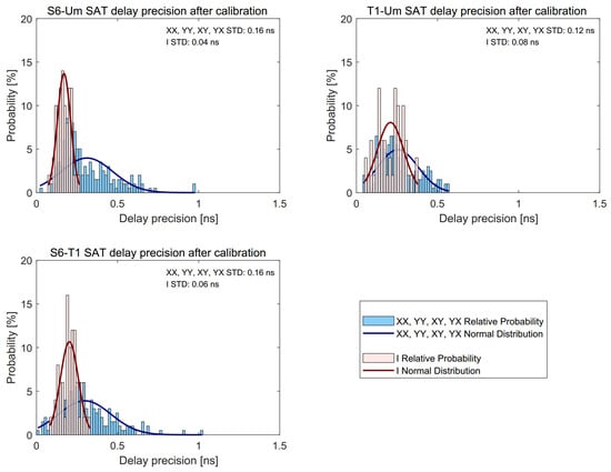 Relative probability distribution of the delay precision in satellite signals, corresponding to the S6-Um, T1-Um, and S6-T1 baselines.