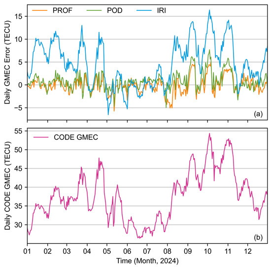 Figure 7a presents the daily mean error time series for the 2024 test dataset, where CODE GMEC is used as the reference, and the error profiles of POD GMEC, PROF GMEC, and IRI-derived GMEC (IRI GMEC) are compared.