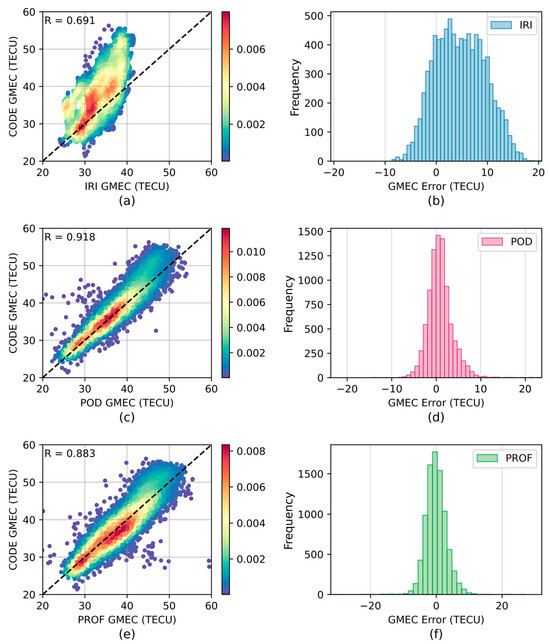 Table 3 summarizes the statistical performance of the three GMEC approaches over the entire test period. The IRI-2020 model yields a mean absolute error (MAE) of 5.5 TECU and a root mean square error (RMSE) of 6.8 TECU. In comparison, the POD model achieves an MAE of 2.2 TECU and an RMSE of 3.5 TECU, representing improvements of 60.0% and 48.5%, respectively. The PROF model records an MAE of 2.5 TECU and an RMSE of 3.5 TECU, corresponding to improvements of 54.5% and 48.5%, respectively.