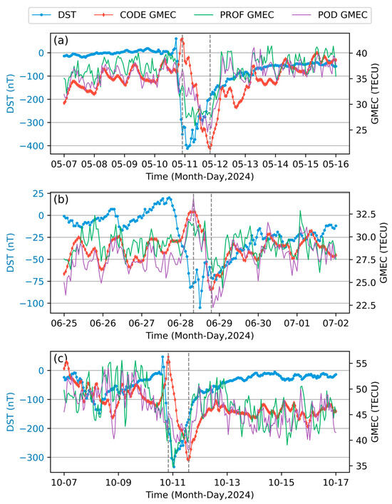 Figure 9a–c correspond to the geomagnetic storms that occurred on 10–13 May, 28–29 June, and 10–11 October of 2024, respectively. The minimum Dst values during these events reached –412 nT, –335 nT, and –105 nT, indicating strong storm intensities. The vertical dashed lines in the figure indicate the times of the maximum and minimum values of the CODE GMEC, highlighting the key moments of ionospheric disturbances during each geomagnetic storm. All three events were triggered by coronal mass ejections impacting the Earth’s magnetosphere. Prior to the onset of the storms, the geomagnetic field remained relatively stable with Dst values near zero. Following each storm event, the Dst value gradually recovers back to near zero, indicating the restoration of the geomagnetic field. Notably, significant disturbances in GMEC were observed during each of the three storm periods. A clear correlation was found between storm intensity and GMEC fluctuation magnitude—stronger geomagnetic storms were associated with more pronounced GMEC variations.