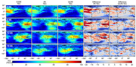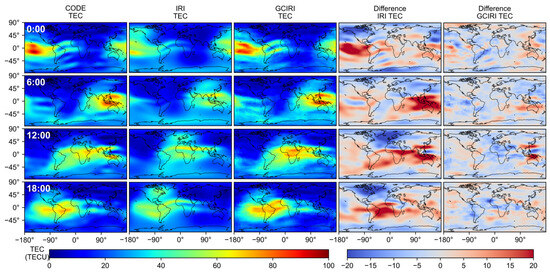 Figure 10 illustrates the TEC distribution maps for the CODE TEC, IRI TEC, and GCIRI TEC over six-hour intervals on 5 January 2024, during the geomagnetic quiet period, along with the error distribution maps for IRI TEC and GCIRI TEC. From the global TEC distribution, the GCIRI TEC is closer to the CODE TEC than the IRI TEC, both in terms of overall distribution and local details. This is particularly evident in regions of stronger ionospheric activity (higher TEC values), where the GCIRI TEC more accurately reflects the true TEC values. Further analysis of the TEC error distribution shows that the corrected IRI TEC model significantly reduces estimation errors worldwide, with notable improvements in both underestimated and overestimated areas.