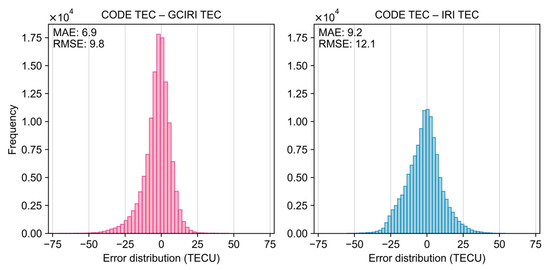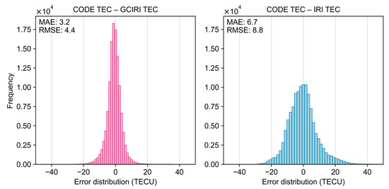 Figure 15 presents the error distribution histograms for the GCIRI TEC and IRI TEC models throughout the entire day during the geomagnetic storm on 28 June 2024. Compared to the original IRI TEC model, the GCIRI TEC model aligns more closely with the CODE TEC. The error distribution of the IRI TEC model has a broader range, spanning from −50 TECU to +50 TECU, while the error distribution of the corrected IRI TEC model is notably narrower, indicating an improvement in accuracy. The IRI TEC model has a Mean, MAE, and RMSE of −1.9 TECU, 9.2 TECU, and 12.1 TECU, respectively. In contrast, the GCIRI TEC model has a Mean, MAE, and RMSE of −2.8 TECU, 6.9 TECU, and 9.8 TECU. The GCIRI TEC model shows improvements of 24.9% in MAE and 19.2% in RMSE, demonstrating enhanced accuracy.