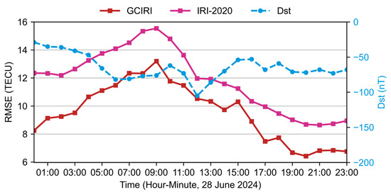 Figure 16 presents the variation in RMSE of the GCIRI TEC and IRI TEC relative to the CODE TEC over UT time during the geomagnetic storm period on 28 June 2024. Under geomagnetically disturbed conditions, ionospheric activity intensifies significantly, resulting in larger fluctuations, with RMSE reaching 12–16 TECU for IRI and 8–13 TECU for GCIRI. Overall, GCIRI exhibits lower RMSE values compared to IRI, with a consistent improvement of approximately 1 to 4 TECU, indicating that GCIRI maintains a certain degree of robustness even under strong geomagnetic disturbances. Notably, starting from 00:00, the RMSE of both models increases gradually, reaching a peak around 09:00, and declining to stabilized low-error levels after 17:00 UT. This diurnal variation closely aligns with the trend of Dst index, reflecting a typical ionospheric response to geomagnetic storm activity.