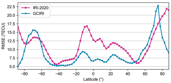 Figure 13 presents RMSE statistics across different latitudes. The IRI TEC exhibits substantial latitudinal variability in RMSE, ranging from 3.8 TECU to 14.1 TECU, with notably inferior performance in low-latitude regions and high-latitude areas of the Southern Hemisphere. In contrast, the GCIRI TEC demonstrates significant accuracy improvements, maintaining RMSE values between 2.6 TECU and 6.7 TECU. Elevated errors for the GCIRI are primarily confined to equatorial latitudes (−20° to 20°), while the most pronounced accuracy enhancements occur at mid-to-high Southern Hemisphere latitudes.