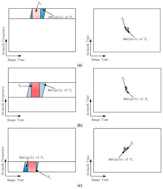 Schematic diagram of image domains corresponding to different azimuth sub-spectra. The left column shows the distribution of points Pm and Pa in different azimuth sub-spectra, while the right column displays the corresponding image domain. Red represents the main zone signal, blue represents azimuth ambiguity signals, with color depth representing energy intensity. By comparing (a–c), it can be observed that the imaging of main zone signals remains essentially consistent across different sub-spectra, while azimuth ambiguity signals exhibit positional shifts and intensity variations in different azimuth sub-spectra.