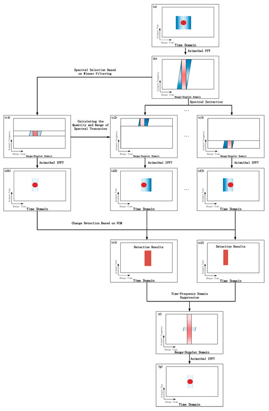 Schematic diagram of the joint time-frequency algorithm for detecting and suppressing azimuth ambiguities. (a) represents that the image domain contains an ambiguity which is shown in blue and a real target which is shown in red; (b) is the azimuth Fourier transform result of (a); (c1) represents the result of spectrum selection, while (c2) and (c3) are the spectra truncated based on the spectral width of (c1); (d1–d3) are the inverse azimuth Fourier transform results of (c1–c3) respectively; (e1) is the change detection result between (d1) and (d2); (e2) is the change detection result between (d1) and (d3); (f) is the ambiguity suppression result in range-time azimuth-frequency domain; (g) is the ambiguity suppression result in image domain.