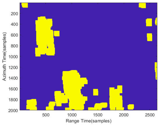 The fusion map of detection results of different sub-spectra, where the yellow regions represent the area where azimuth ambiguity signals exist.