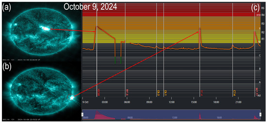 Solar flare effects recorded on 9 October: (a) the locations of AR3848, (b) AR3842 (red circle) over the solar disc, and (c) solar flares recorded on 9 October.