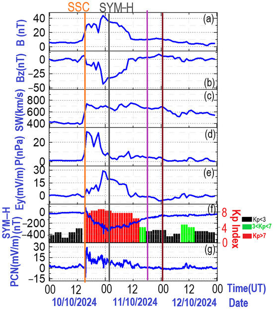 Geomagnetic conditions during the October storm event depicted in (a) total magnitude B of IMF, (b) Bz component of IMF, (c) solar wind speed, (d) solar wind pressure, (e) interplanetary electric field (IEF) Ey, (f) SYM-H and Kp index and (g) Polar Cap (PCN) Index. The orange vertical lines represent the SSC, the grey vertical line denotes the time of the SYM-H index minima during the storm, the purple vertical line represents when SYM–H < −100 nT, and the brown vertical line represents the end of the recovery phase of the ionosphere.