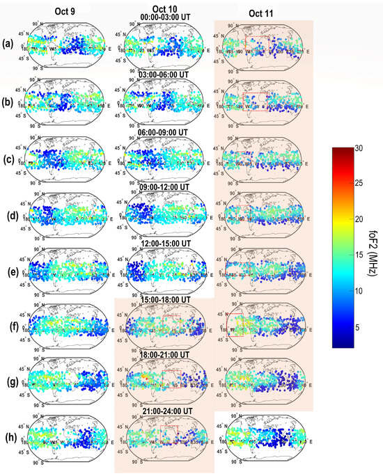 (a–h) Variation in foF2 (MHz) from COSMIC—2 RO during 9–11 October from (a) 00:00–03:00 UT, (b) 03:00–06:00 UT, (c) 06:00–09:00 UT, (d) 09:00–12:00 UT, (e) 12:00–15:00 UT, (f) 15:00–18:00 UT, (g) 18:00–21:00 UT, and (h) 21:00–24:00 UT. The yellow highlighted section represents the storm period (initial phase of the storm to SYM–H < −100 nT during the recovery phase). The red rectangles in the subfigures represent the absence of foF2 values during the storm period.