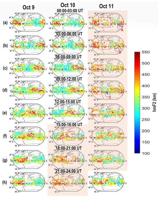 Between 00:00 and 03:00 UT, coinciding with the SYM–H minimum, foF2 decreased significantly over the Southern Hemisphere nighttime sector. Simultaneously, a significant reduction in hmF2 was recorded over the isolated Australian longitudes (marked as “A” in Figure 4). Although storm activity weakened during the subsequent recovery phase, ionospheric disturbances remained pronounced in the Southern Hemisphere until approximately 12:00 UT. Isolated regions, marked as “B” and “C” in Figure 4, also showed severely low hmF2 values during this period. Moreover, the previously noted data gap migrated westward over time—from the Afro-European region to the Atlantic sector, and eventually to the Western Pacific by 18:00 UT on 11 October.