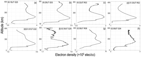 (a–h) Electron density profiles of COSMIC—2 RO on 11 October from 00:00–03:00 UT over the region “A” marked in Figure 4a.