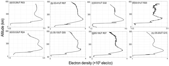 (a–h) Electron density profiles of COSMIC—2 RO on 11 October from 03:00–06:00 UT over the region “B” marked in Figure 4b.