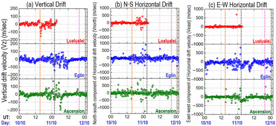 To examine ionospheric drift velocities during the storm, we extracted vertical (Vz) and horizontal (Vnorth and Veast) drift velocities from the University of Massachusetts Lowell Center for Atmospheric Research (UMLCAR) Digisonde drift database (https://lgdc.uml.edu/common/DFDBFastStationList accessed on 23 April 2025). Due to limited data availability, we focused on three stations: Lualualei (21.43°N–158.15°E), Eglin (30.5°N–86.5°E), and Ascension Island (−7.95°N–14.4°E). Drift velocities from 00:00 UT on 10 October to 02:00 UT on 12 October were extracted using the DriftExplorer (version 1.2.14) tool (https://ulcar.uml.edu/Drift-X.html accessed on 23 April 2025), offering insight into the electric field-driven plasma transport across different latitudes.