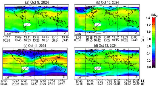 (a–d) Global variation in [O/N2] ratio on (a) 9 October, (b) 10 October, (c) 11 October, and (d) 12 October.