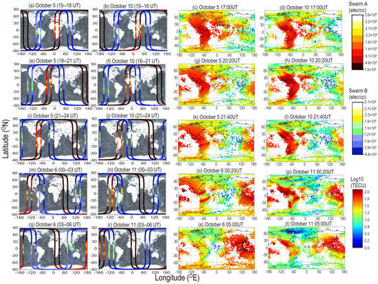 (a–t) Three-hour global tracks of Swarm Ne (Swarm A represented by brown tracks and Swarm B represented by blue tracks). The leftmost column represents the Swarm tracks from 15:00 UT on 5 October to 06:00 UT on 6 October, a geomagnetically quiet period for reference. The second column depicts the storm-time Swarm tracks from 15:00 UT on 10 October to 06:00 UT on 11 October. The third and fourth columns represent the madrigal global TEC maps during the geomagnetically quiet and disturbed periods.
