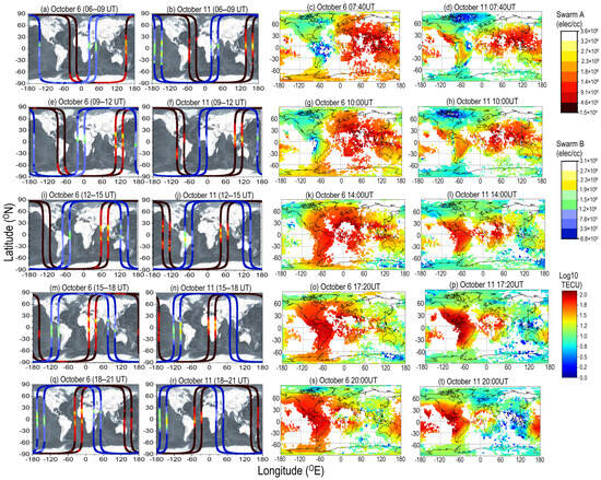 (a–t) Three-hour global tracks of Swarm Ne (Swarm A represented by brown tracks and Swarm B represented by blue tracks). The leftmost column represents the Swarm tracks from 06:00 UT to 21:00 UT on 6 October, a geomagnetically quiet period for reference. The second column depicts the storm-time Swarm tracks from 06:00 UT to 21:00 UT on 11 October. The third and fourth columns represent the madrigal global TEC maps during the geomagnetically quiet and disturbed periods.