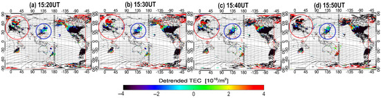 (a–d) LSTIDs detected in the global dTEC map over the Northern Hemisphere on 10 October during (a) 15:20UT, (b) 15:30UT, (c) 15:40UT, and (d) 15:50UT.