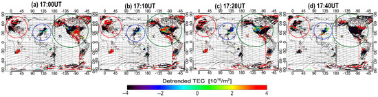 (a–d) LSTIDs detected in the global dTEC map over the Northern Hemisphere on 10 October during (a) 17:00 UT, (b) 17:10UT, (c) 17:20UT, and (d) 17:40UT.