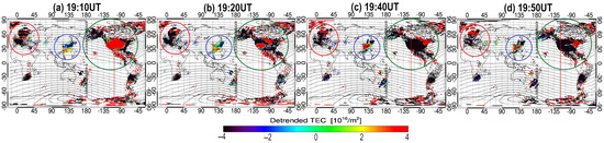 (a–d) LSTIDs detected in the global dTEC map over the Northern Hemisphere on 10 October during (a) 19:10UT, (b) 19:20UT, (c) 19:40UT, and (d) 19:50UT.