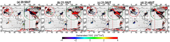 (a–d) LSTIDs detected in the global dTEC map over the Northern Hemisphere on 10 October (a) 20:50UT, (b) 21:10UT, (c) 21:30UT, and (d) 21:40UT.