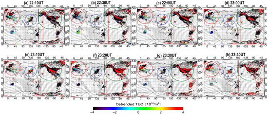 (a–h) LSTIDs detected in the global dTEC map over the Northern Hemisphere on 10 October during (a) 22:10UT, (b) 22:30UT, (c) 22:50UT, (d) 23:00 UT, (e) 23:10UT, (f) 23:20UT, (g) 23:30UT, and (h) 23:40UT.