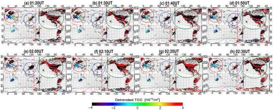 (a–h) LSTIDs detected in the global dTEC map over the Northern Hemisphere on 10 October during (a) 01:20UT, (b) 01:30UT, (c) 01:40UT, (d) 01:50UT, (e) 02:00 UT, (f) 02:10UT, (g) 02:20UT, and (h) 02:30UT.