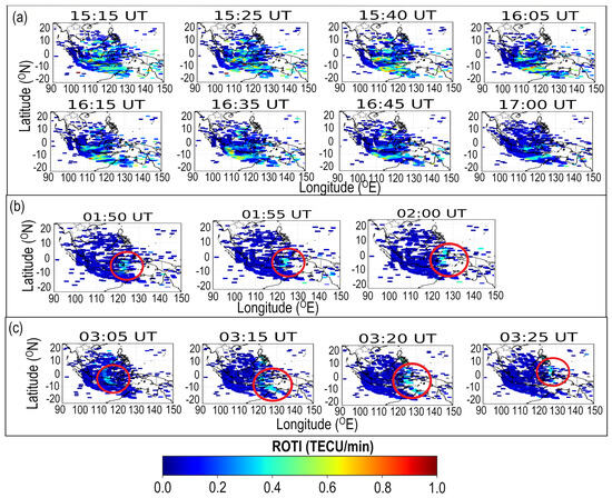 Although the global dTEC maps mentioned above provide dense coverage over the Northern Hemisphere, their resolution is significantly lower in the Southern Hemisphere, particularly over the Asian sector. To investigate the ionospheric response to the geomagnetic storm in the Southeast Asian region, we utilized ROTI data from the Ina-CORS GNSS network. Figure 18a–c display the storm-time ROTI maps for this region. Figure 18a shows the ROTI distribution during the initial phase of the storm, specifically from 15:00 to 17:00 UT on 10 October. It is important to note that the local time (LT) in this region is approximately 7.5 h ahead of UT, placing this interval during nighttime conditions. As seen in Figure 18a, significant ROTI perturbations exceeding 1 TECU/min are evident in the Southern Hemisphere sector. These irregularities began to emerge around 15:15 UT, intensified by 15:40 UT, and started to diminish after 16:45 UT. A distinct southwestward propagation of these structures can be observed. Similar findings were reported by Abadi et al. (2025) [26] during the Mother’s Day 2024 superstorm, where enhanced ROTI values were observed during post-sunset hours across Southern Australia. They attributed these enhancements to either the equatorward expansion of auroral activity or the influence of the midlatitude trough. According to their study, the irregularities initially appeared near 150°E at around 12:50 UT, and subsequently propagated northwestward and southwestward over the Japanese and Australian sectors, respectively. As the storm evolved, these equatorial irregularities diminished. During the recovery phase, at approximately 01:50 UT, weak ROTI perturbations (~0.4 TECU/min) were observed near the geographic equator, as shown in Figure 18b (highlighted by the red circle), followed by another brief occurrence between 03:05 and 03:25 UT, depicted in Figure 18c. These later disturbances were notably weaker in intensity.