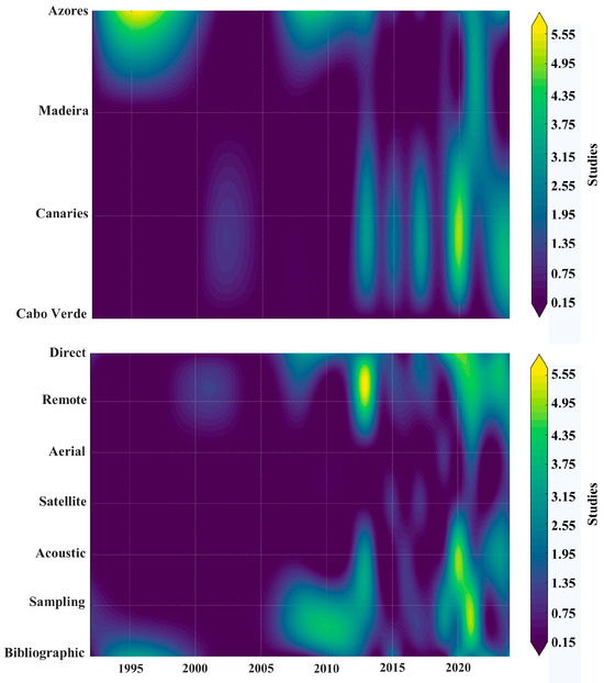Temporal changes in the number of studies by region (top) and by type of sampling method (bottom) in the context of marine research in Central-Eastern Atlantic archipelagos. The color intensity represents the density of surveys over time (1990–2025), with higher values in yellow and lower values in purple.