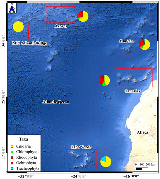 Spatial distribution of the study regions in Central-Eastern Atlantic archipelagos and the Mid-Atlantic Ridge, with proportional representation of the main taxonomic categories registered in each region.