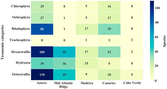 Species richness by taxonomic category and region in the Central-Eastern Atlantic archipelagos and the Mid-Atlantic Ridge. The matrix shows the number of species recorded per group.